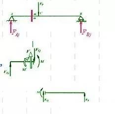 此時(shí),左段上作用有外力FAy,為保持平衡,截面m-m 上一定作用有與之平衡的內(nèi)力,將左段上的所有外力向截面m-m 的形心平移,得到垂直于梁軸線的外力Fˊ及作用在梁對(duì)稱面內(nèi)的外力偶矩Mˊ,根據(jù)平衡要求,截面m-m 上必然有剪力FQ和彎矩M 存在,二者分別與Fˊ與Mˊ大小相等、方向相反。