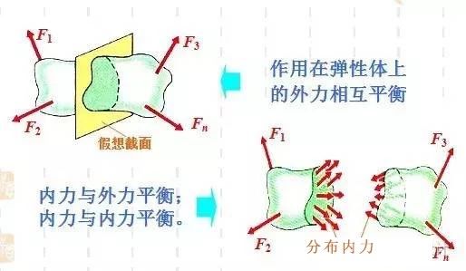 當(dāng)用假想截面將桿件截開,考察其中任意一部分平衡時(shí),實(shí)際上已經(jīng)將這一部分當(dāng)作剛體,所以所用的平衡方法與在工程靜力學(xué)中的剛體平衡方法完全相同。